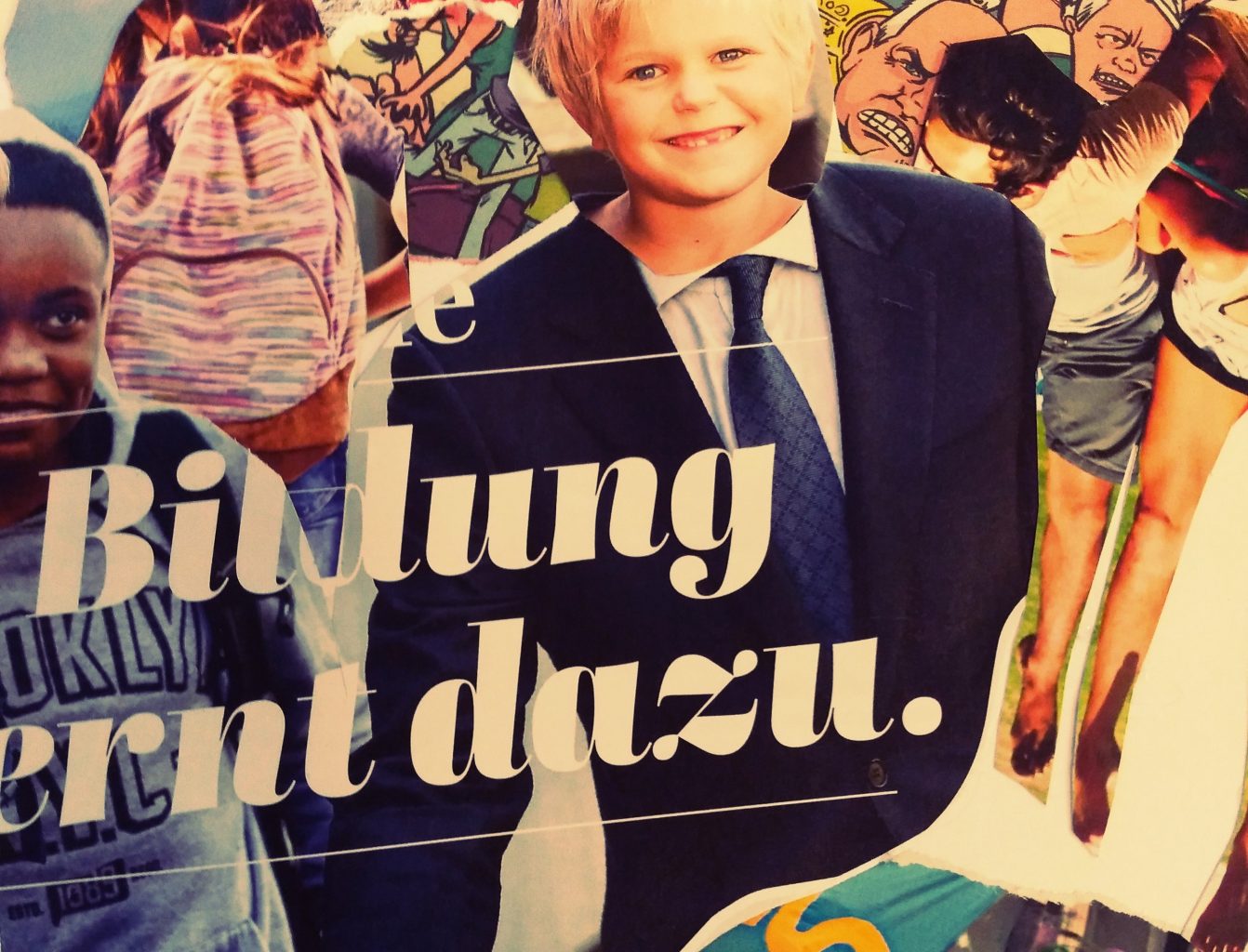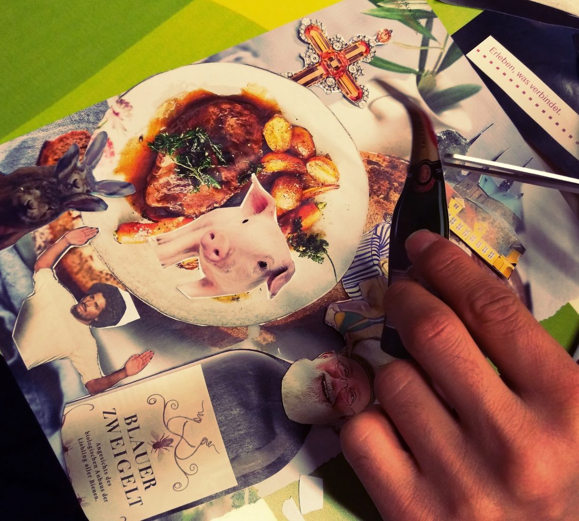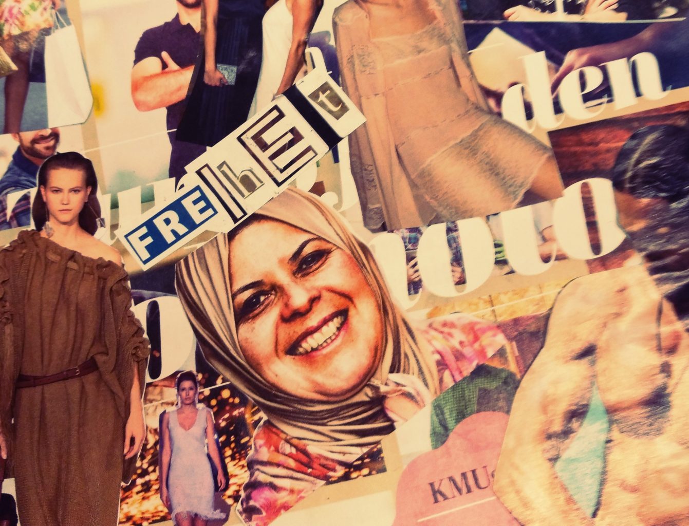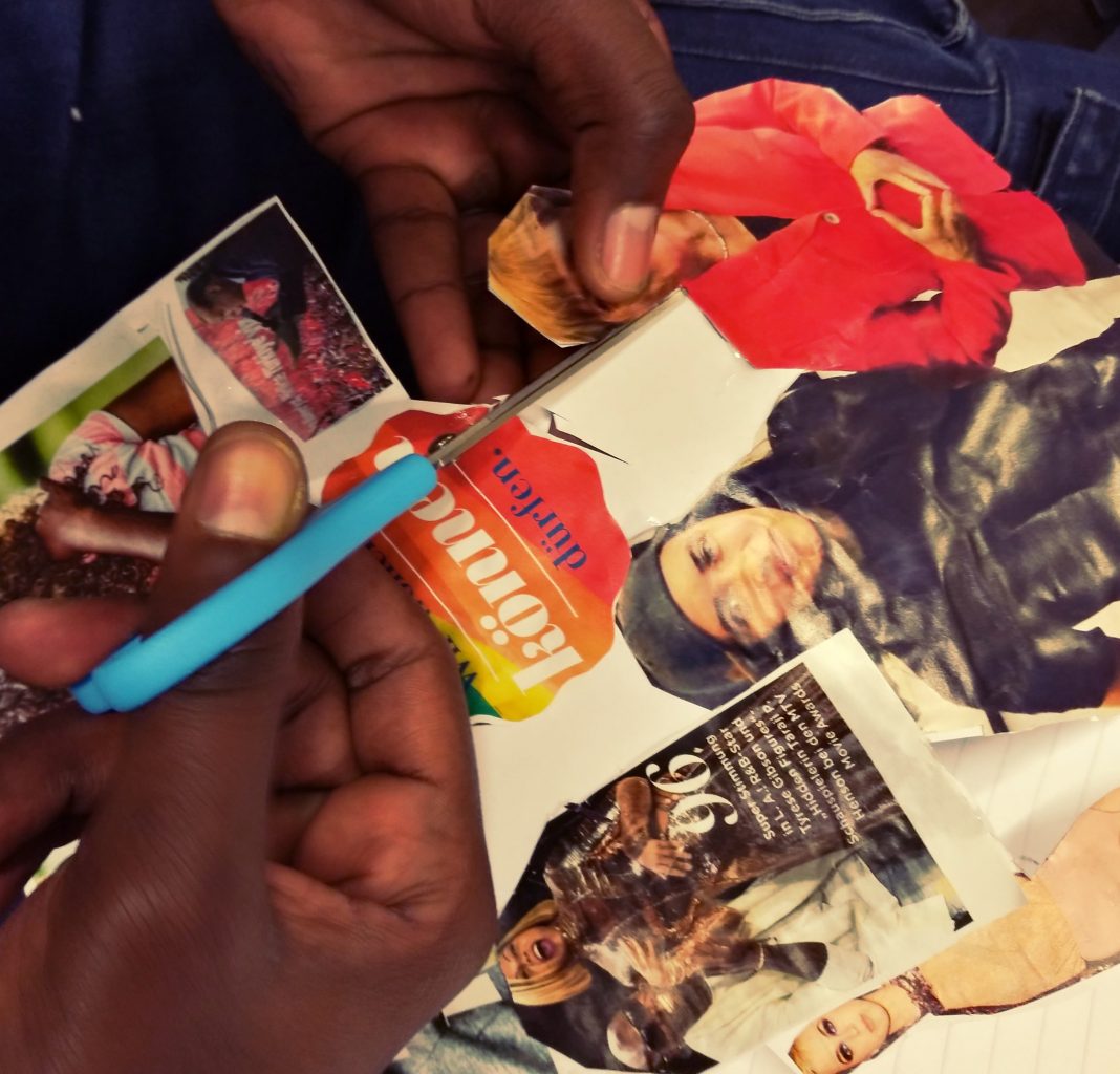 In einem zweiten Schritt haben wir geschaut, welche Themen bei den Jugendlichen besonders starke Aufmerksamkeit auf sich gezogen haben. Diese Themen sind dann künstlerisch umgesetzt worden und zwar mit Hilfe von Collagen. Themen wie Freiheit, Natur, Menschenrechte, Angst und Religion haben so ihre teils auch kritische künstlerische Umsetzung gefunden.