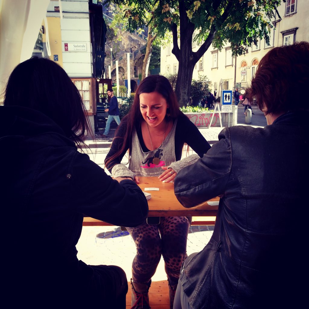 Für uns ist die Vielfalt an Sprachen in Europa eine Möglichkeit, dass Miteinander trotz eben dieser verschiedener Sprachen zu thematisieren. In diesem Fall haben wir die Vielfalt der Sprachen die in Graz gesprochen werden im gemeinsamen Tun sichtbar machen. Ein riesiges Strassenkreide-Meer an Sprachen hat den Schlossbergplatz geziert – von Polnisch über Georgisch bis Arabisch. Zusätzlich ahben wir einen kleinen Radiobeitrag produziert und zusätzlich mit Händen und Füßen beim „Europa-Sehenswürdigkeiten-Raten“ Jugendliche zum Mitmachen animiert.